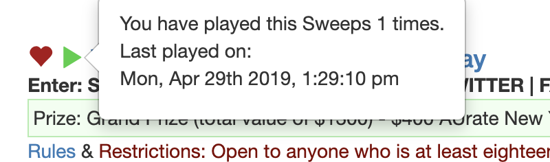 entered a Sweep. We will keep track of every time you have entered a sweepstakes so we can tell you